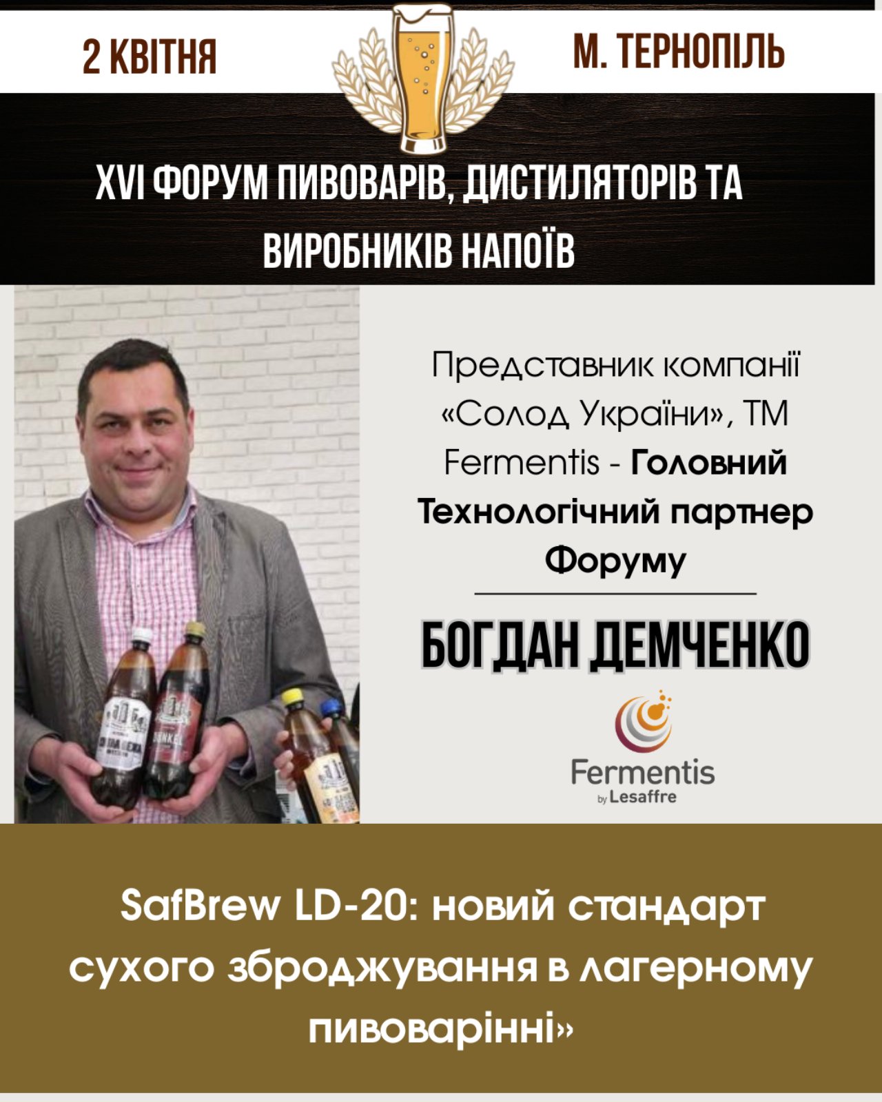 Як підвищити стабільність і керованість лагерного зброджування? Та які інновації вже сьогодні задають новий технологічний стандарт для виробників пива? На ці питання відповість Богдан ДЕМЧЕНКО на XVІ Форумі пивоварів, дистиляторів та виробників напоїв «Beer&Craft Drink Forum 2026», що відбудеться 2 квітня у місті Тернопіль в готелі «Vatra». Представник компанії «Солод України» та ТМ Fermentis — Головного Технологічного партнера Форуму — презентує SafBrew LD-20 як новий стандарт сухого зброджування в лагерному пивоварінні й розповість, які можливості відкриває цей підхід для сучасних броварень.