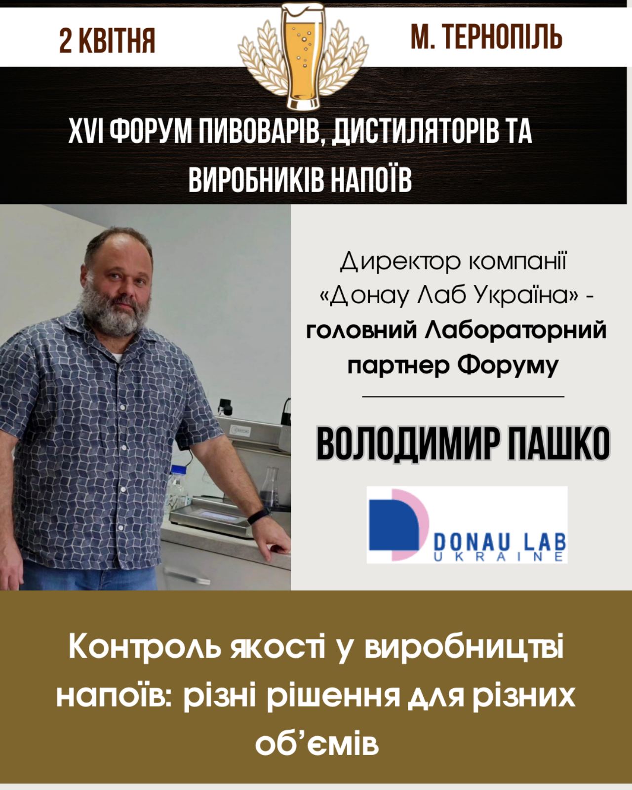 Виробники напоїв прагнуть, щоб їхня продукція була стабільно якісною. Домогтися цього можливо лише завдяки регулярному контролю всіх етапів виробництва. У цьому допомагають сучасні портативні прилади австрійської компанії Anton Paar, які дозволяють швидко й точно вимірювати основні параметри напоїв. Чому потрібен контроль навіть на мікропивоварні? Які інструменти і для яких об’ємів виробництва існують? Дізнайтеся про це на XVІ Форумі пивоварів, дистиляторів та виробників напоїв «Beer&Craft Drink Forum 2026»: Пиво. Напої. Технології, що відбудеться 2 квітня в Тернополі, у готелі «Vatra». Про контроль якості на виробництві напоїв розповість Володимир ПАШКО, директор компанії «Донау Лаб Україна», Головного Лабораторного партнера Форуму.